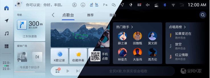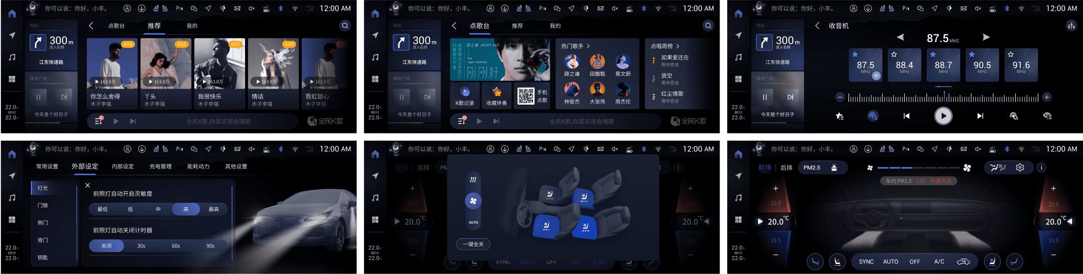 主要功能模块:车辆设置(外部设定、内部设定)、在线媒体(腾讯爱趣听)、全民k歌等