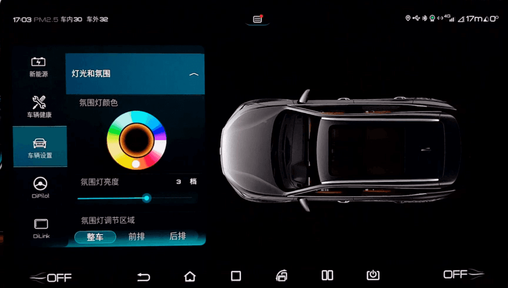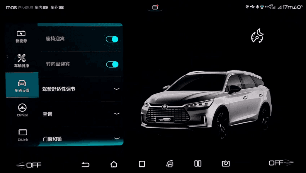 主要功能模块:车辆设置(外部设定、内部设定、能量管理、预约充电、驾驶辅助)、在线媒体(腾讯爱趣听)、本地媒体(蓝牙音乐、USB音乐)、全民K歌、日历等